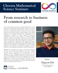 This Cheenta Mathematical Science Seminar brings together ideas from research, industry, and innovation to explore how advanced science and technology can be directed towards the common good. Through real-world examples and insights from impact-driven work, the session highlights the journey from deep scientific research to scalable solutions that address pressing social and environmental challenges.