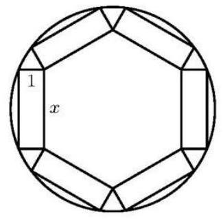 A round table has radius 4. Six rectangular place mats are placed on the table. Each place mat has width 1 and length \(x\) as shown. They are positioned so that each mat has two corners on the edge of the table, these two corners being end points of the same side of length \(x\). Further, the mats are positioned so that the inner corners each touch an inner corner of an adjacent mat. What is \(x\) ? AMC 10 2008