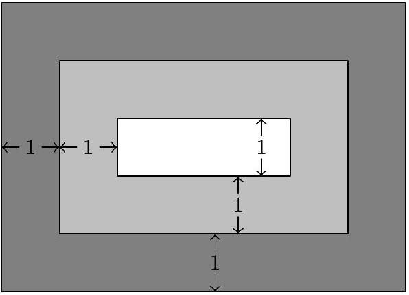 A rug is made with three different colors as shown. The areas of the three differently colored regions form an arithmetic progression. The inner rectangle is one foot wide, and each of the two shaded regions is 1 foot wide on all four sides. What is the length in feet of the inner rectangle?
