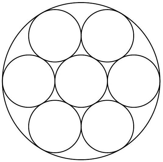 Seven cookies of radius 1 inch are cut from a circle of cookie dough, as shown. Neighboring cookies are tangent, and all except the center cookie are tangent to the edge of the dough. The leftover scrap is reshaped to form another cookie of the same thickness. What is the radius in inches of the scrap cookie?
