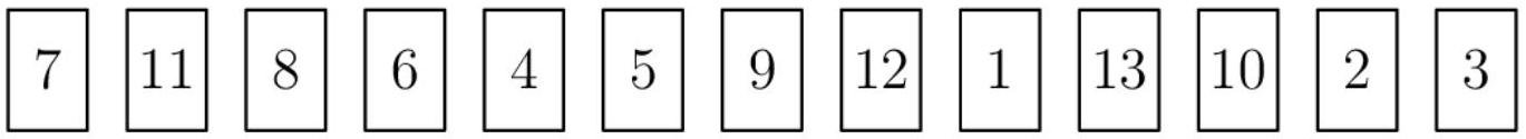 Suppose that 13 cards numbered $1,2,3, \cdots, 13$ are arranged in a row. The task is to pick them up in numerically increasing order, working repeatedly from left to right. In the example below, cards $1,2,3$ are picked up on the first pass, 4 and 5 on the second pass, 6 on the third pass, $7,8,9,10$ on the fourth pass, and $11,12,13$ on the fifth pass.