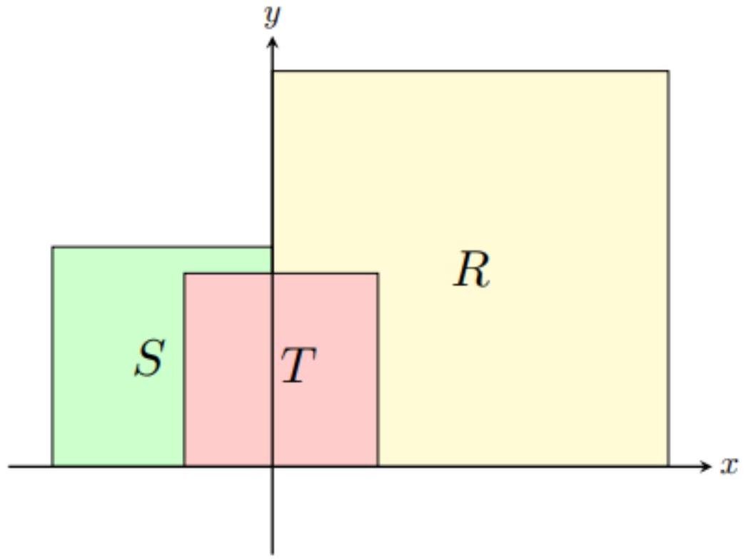 Let $R, S$, and $T$ be squares that have vertices at lattice points (i.e., points whose coordinates are both integers) in the coordinate plane, together with their interiors. The bottom edge of each square is on the x -axis. The left edge of $R$ and the right edge of $S$ are on the $y$-axis, and $R$ contains $\frac{9}{4}$ as many lattice points as does $S$. The top two vertices of $T$ are in $R \cup S$, and $T$ contains $\frac{1}{4}$ of the lattice points contained in $R \cup S$. See the figure (not drawn to scale).
