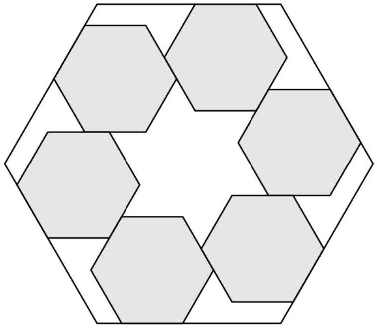 Six regular hexagonal blocks of side length 1 unit are arranged inside a regular hexagonal frame. Each block lies along an inside edge of the frame and is aligned with two other blocks, as shown in the figure below. The distance from any corner of the frame to the nearest vertex of a block is $\frac{3}{7}$ unit. What is the area of the region inside the frame not occupied by the blocks?