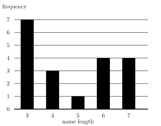 The following bar graph represents the length (in letters) of the names of 19 people. What is the median length of these names?