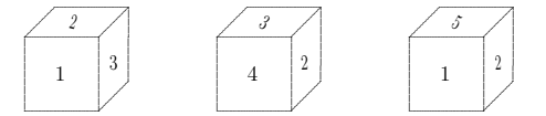 A cube has each of the numbers from 1 to 6 on its faces. The cube is shown in three different positions.