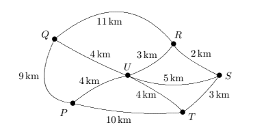 Six towns labelled \(P, Q, R, S, T\) and \(U\) in the diagram are joined by roads as shown.
