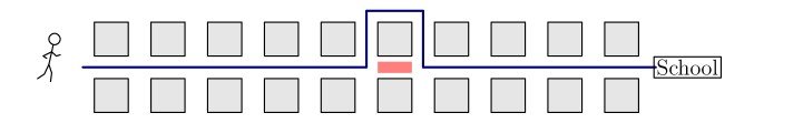 Betty drives a truck to deliver packages in a neighborhood whose street map is shown below. Betty starts at the factory (labled $F$ ) and drives to location $A$, then $B$, then $C$, before returning to $F$. What is the shortest distance, in blocks, she can drive to complete the route?