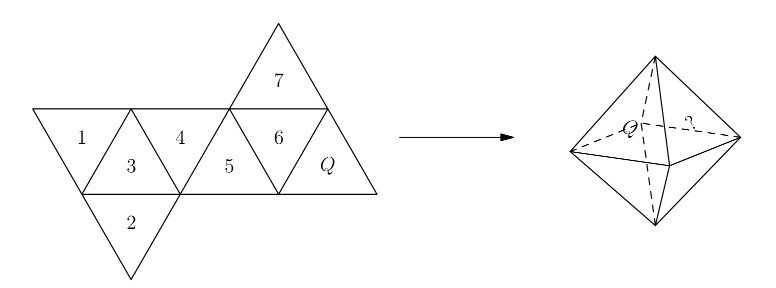 Isaiah cuts open a cardboard cube along some of its edges to form the flat shape shown on the right, which has an area of 18 square centimeters. What is the volume of the cube in cubic centimeters?