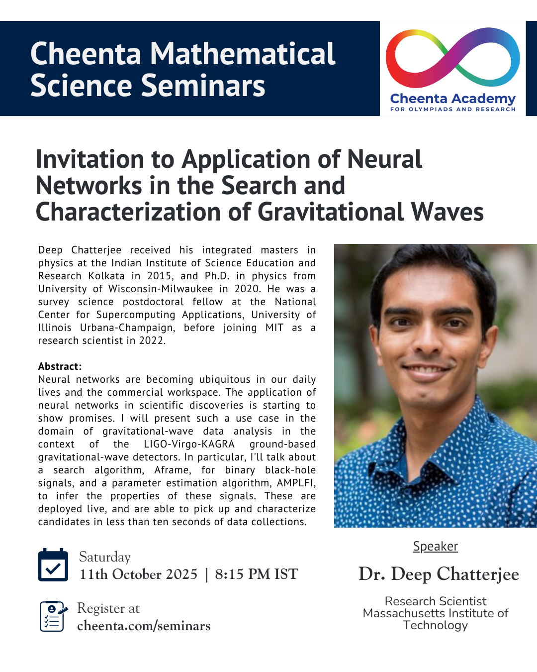 Join Dr. Deep Chatterjee from MIT for a Cheenta Mathematical Science Seminar on the use of neural networks in gravitational-wave research. 11th October 2025 | 8:15 PM IST. Register now at cheenta.com/seminars.