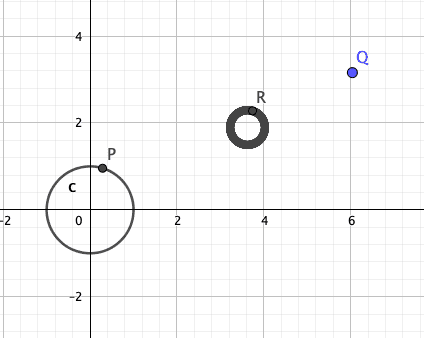 WLOG C be a unit circle centered at (0,0). Then ( P= (\cos(t), \sin (t)) ). Suppose Q = (a, b).