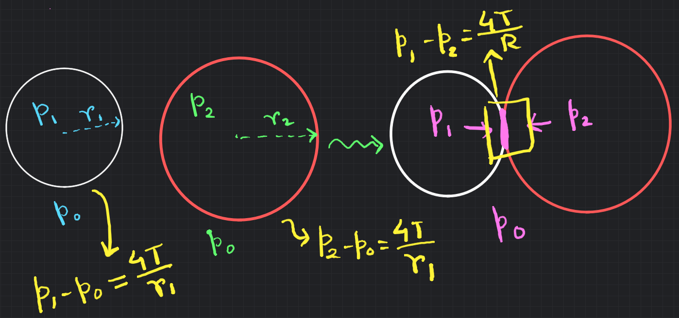 We know $p_1 - p_0 = \frac{4T}{r_1}$ and $p_2 - p_0 = \frac{4T}{r_2}$, Then,